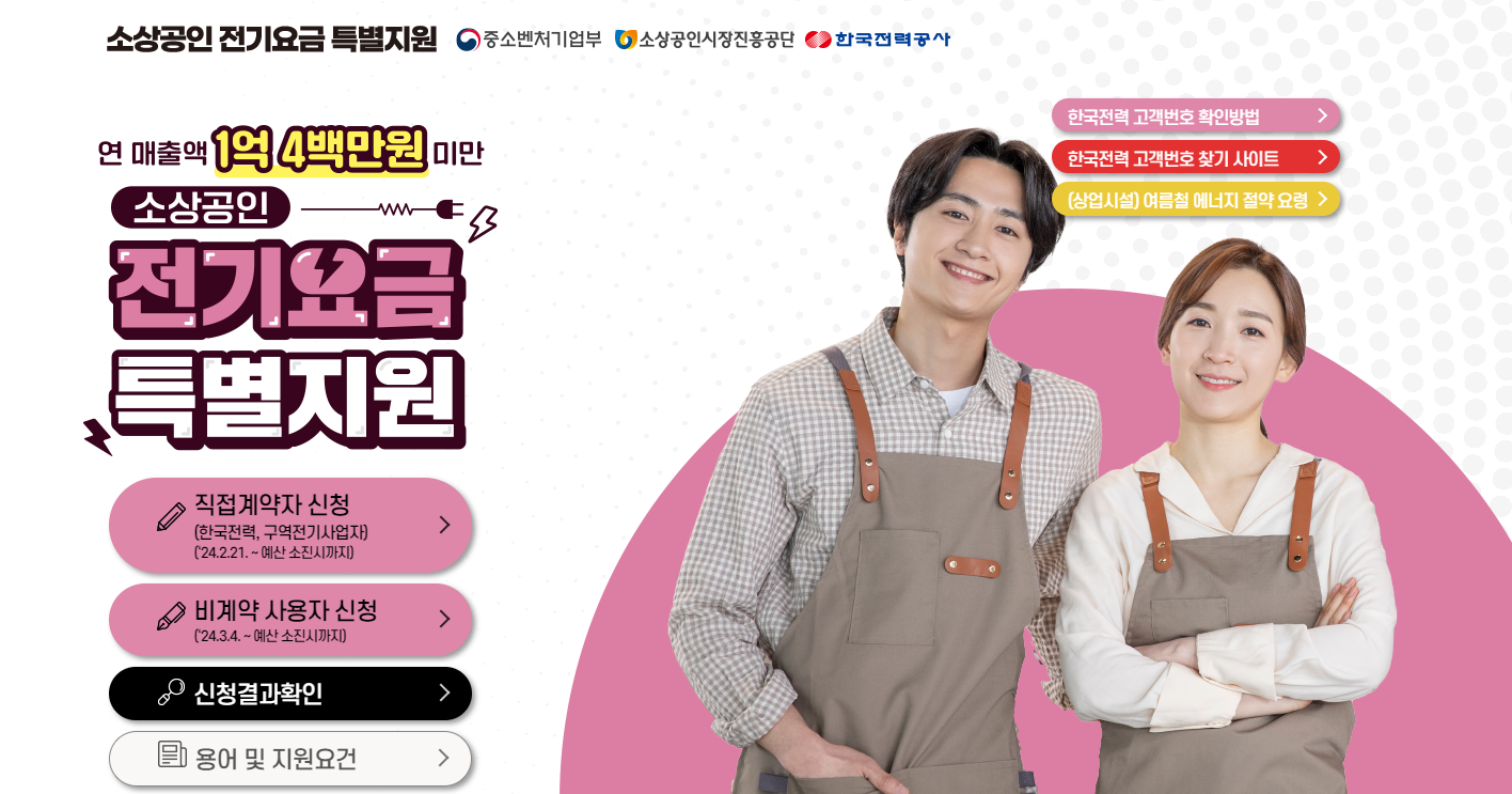 전기요금 계약 종류가 중요한데요. 일반용, 산업용, 농사용, 교육용, 혹은 주택용 중 비주거용으로 부담하는 사업자가 지원이 됩니다. (이 전기요금 계약 종류는 한전ON어플이나 한국전력공사 사이트에 들어가셔서 청구서를 보시면 일반용인지, 산업용인지 표시가 되어있습니다.)