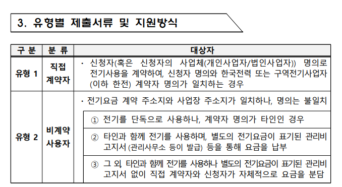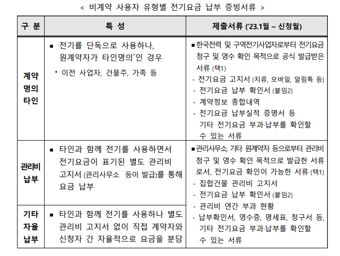 건물주나, 관리소에 관리비로 납부하는 업체는 비계약 사용자로 신청하시면 되세요. 복잡할줄 알았는데, 전기요금 납부 증명 서류를 1개만 납부를 하면 되니 간단했습니다. 비계약자는 최대 20만원까찌 신청자 명의 계좌로 환급된다고 하니 참고해주세요.